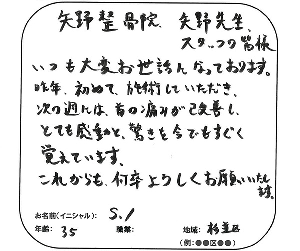 首の痛みが解消し、とても感動と驚きを今でも覚えています! 杉並区荻窪 S.Iさん 35歳