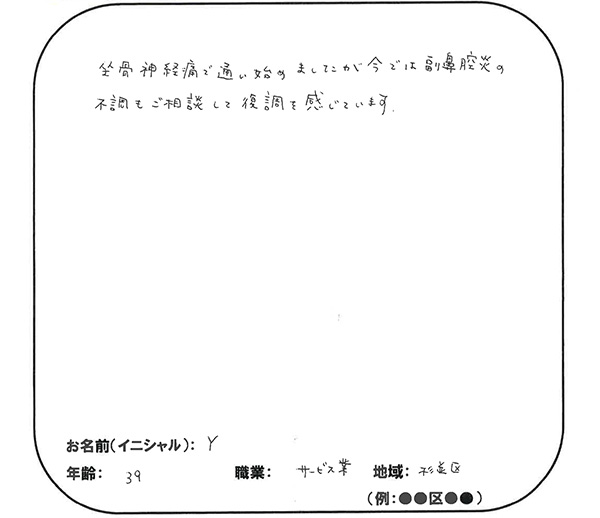 坐骨神経痛で通い始めましたが、今では副鼻腔炎の不調もご相談して復調を感じています。