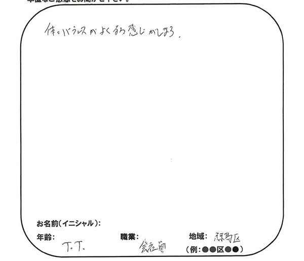 体のバランスが良くなる感じがします。 練馬区 T.Tさん 会社員