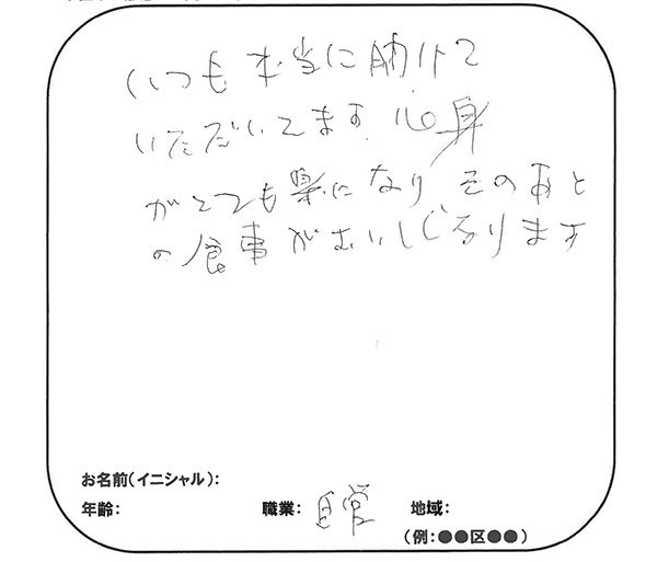 いつも本当に助けていただいてます。 心身がとても楽になり、そのあとの食事がおいしく」なります。